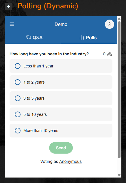 Live, dynamic polling is a great audience interaction tool. Slido is a leader in audience polling and can be seamlessly integrated into a VXP meeting room. Use your Slido account or the VXP account for your event.