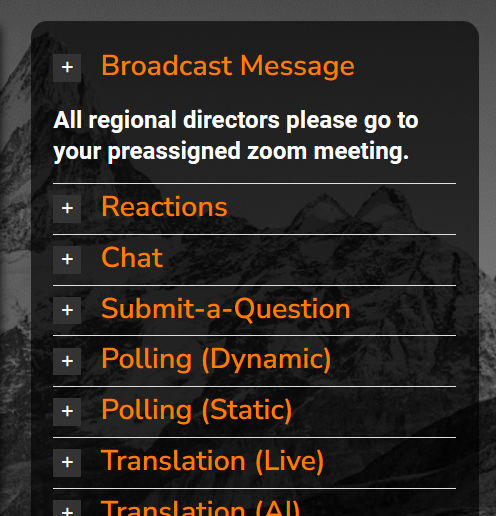 Send a message to all attendees! A Broadcast Message, when requested, closes any other module and displays in bold text the message for all attendees. This may be a simple “Meeting currently on break”, “All Presenters, please go to your assigned breakout sessions” or any message that should be seen by all attendees.